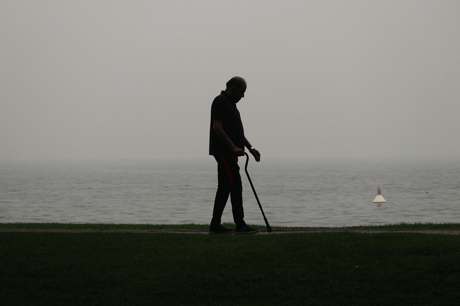 Previous Image Next Image A man goes for a walk in downtown Kelowna, B.C., on Aug. 1, 2021, as wildfire-smoke clouds the air.
