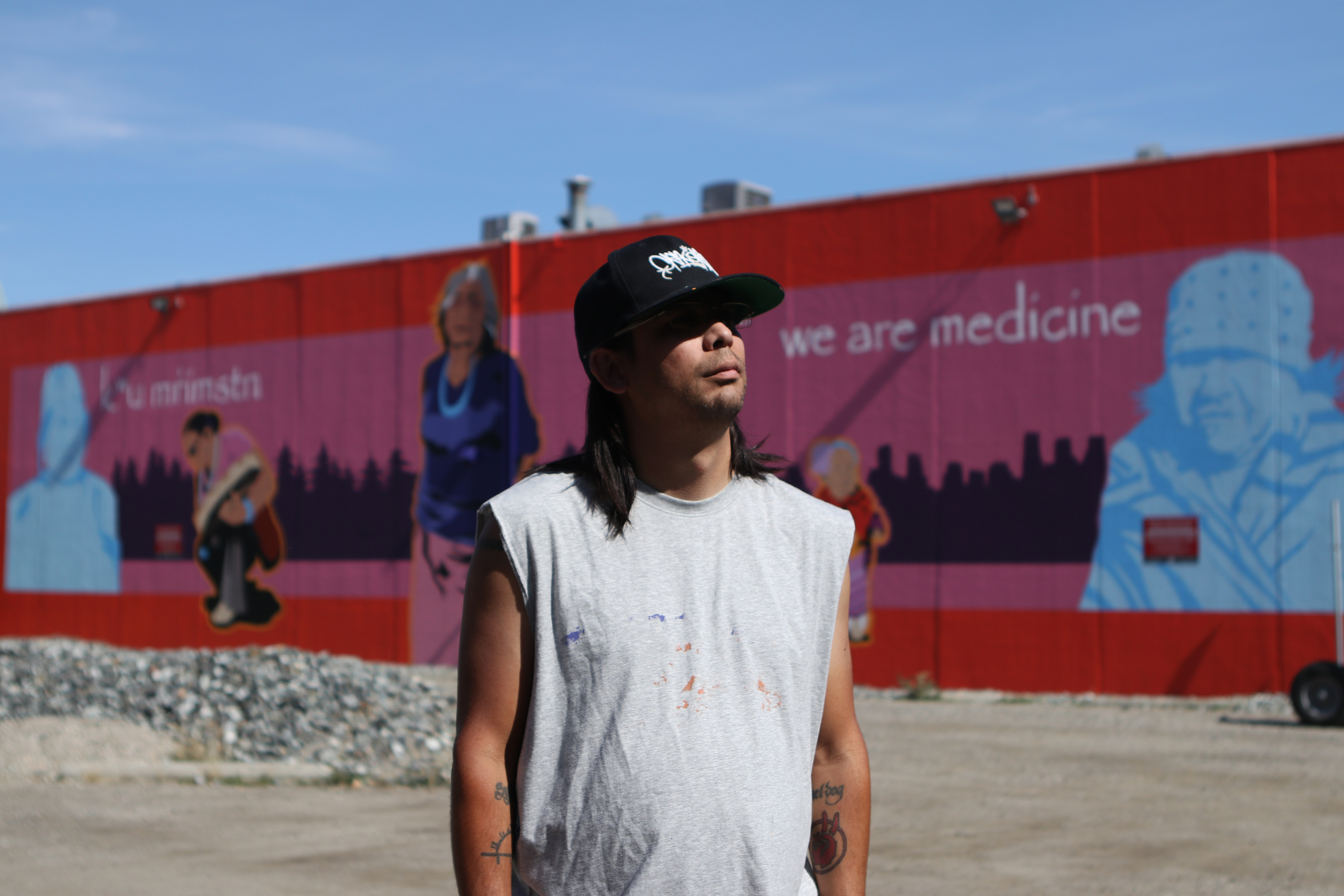 Syilx artist Sheldon Pierre Louis poses by the mural he painted outside of the Gospel Mission shelter in Kelowna, B.C., on Sept. 7, 2021.