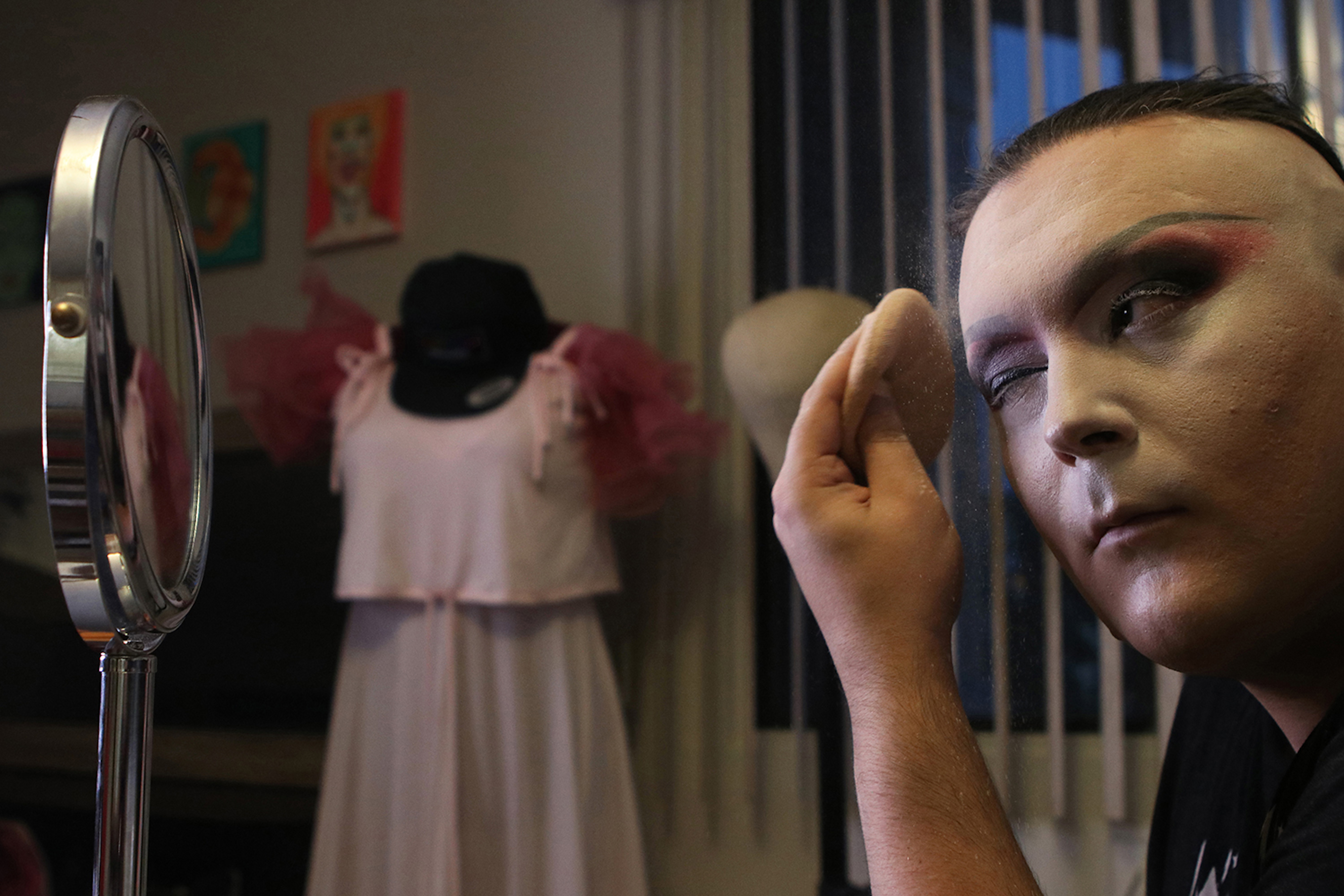 Indigenous drag queen Jenna Telz, also known as Grayson Nordgren, prepares her makeup before a show in Kelowna, B.C., on Oct. 1, 2021.