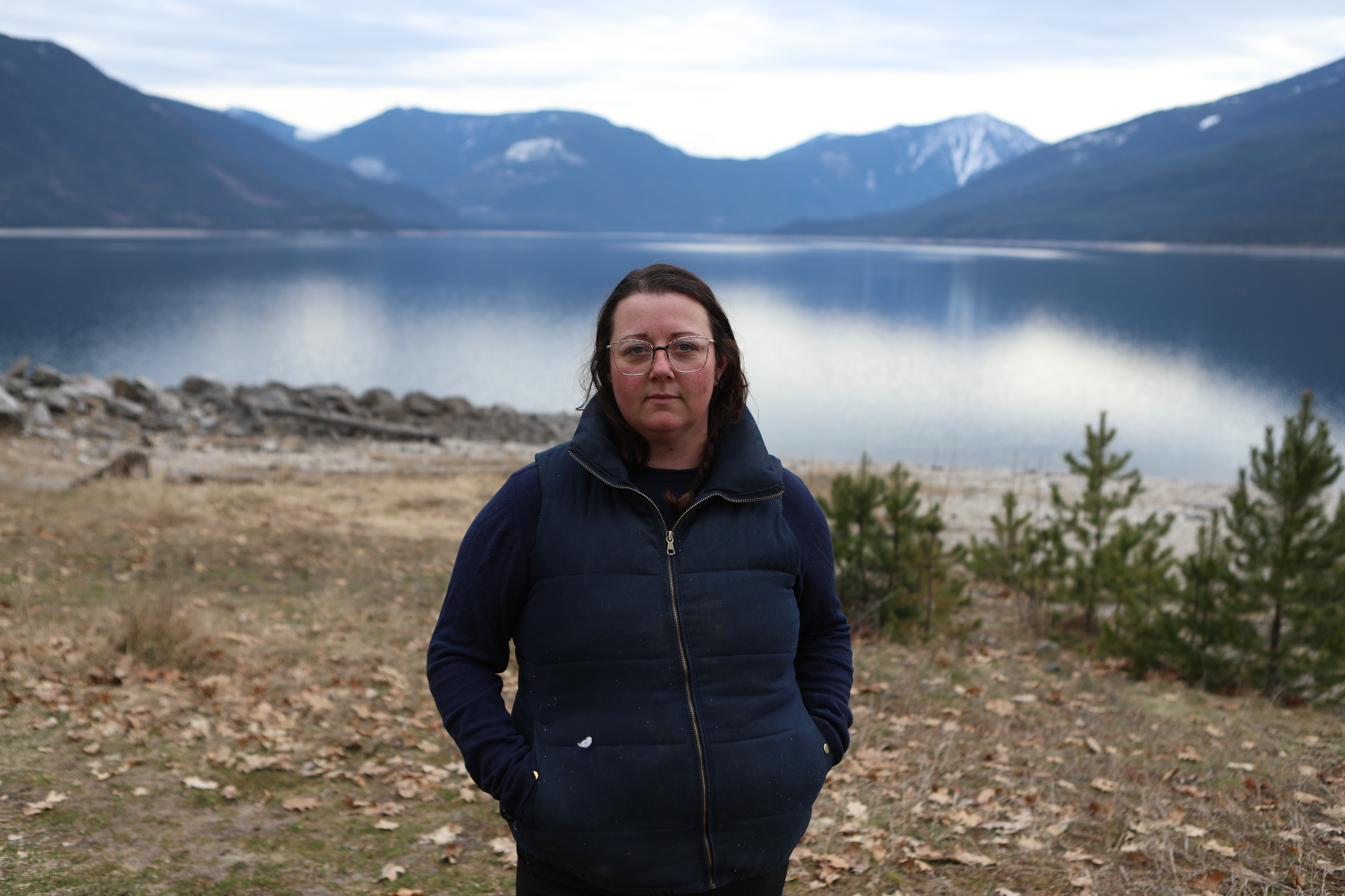 Victoria Youmans stands near the waterfront of Arrow Lakes in Nakusp, B.C., Canada, on March 20, 2024. Originally two lakes, Arrow Lakes became one 230 km-long lake due to the reservoir created by the 1960s construction of the Keenleyside Dam. (Aaron Hemens for the Wall Street Journal)