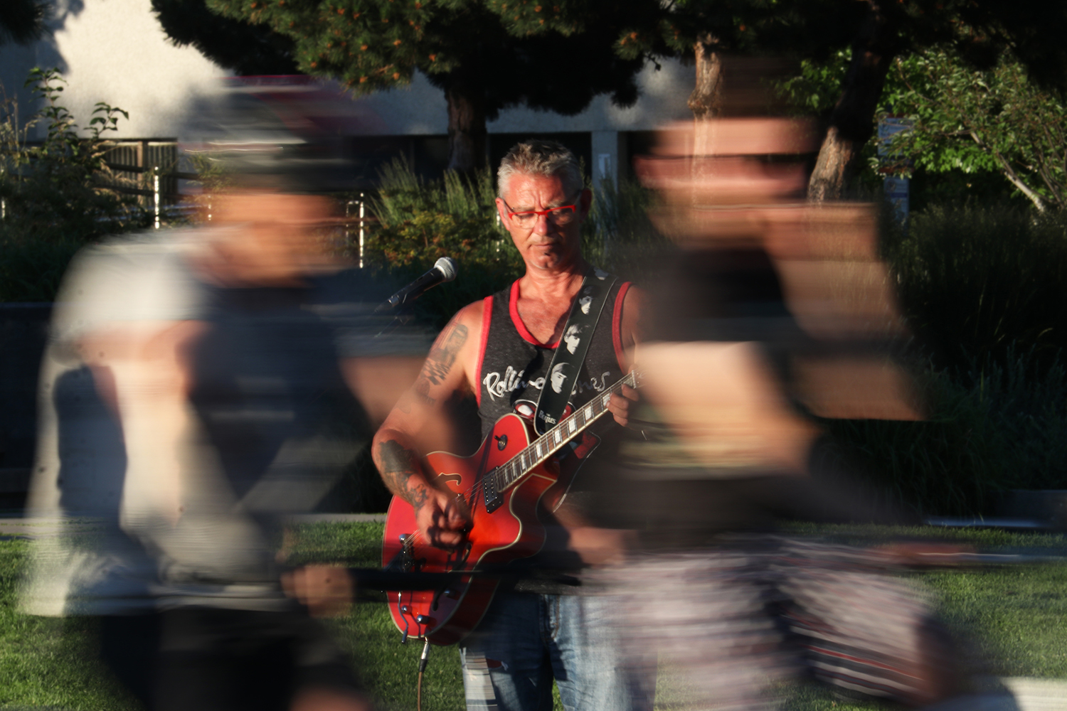 Cyclists ride by a busker in downtown Kelowna, B.C., on June 17, 2021.