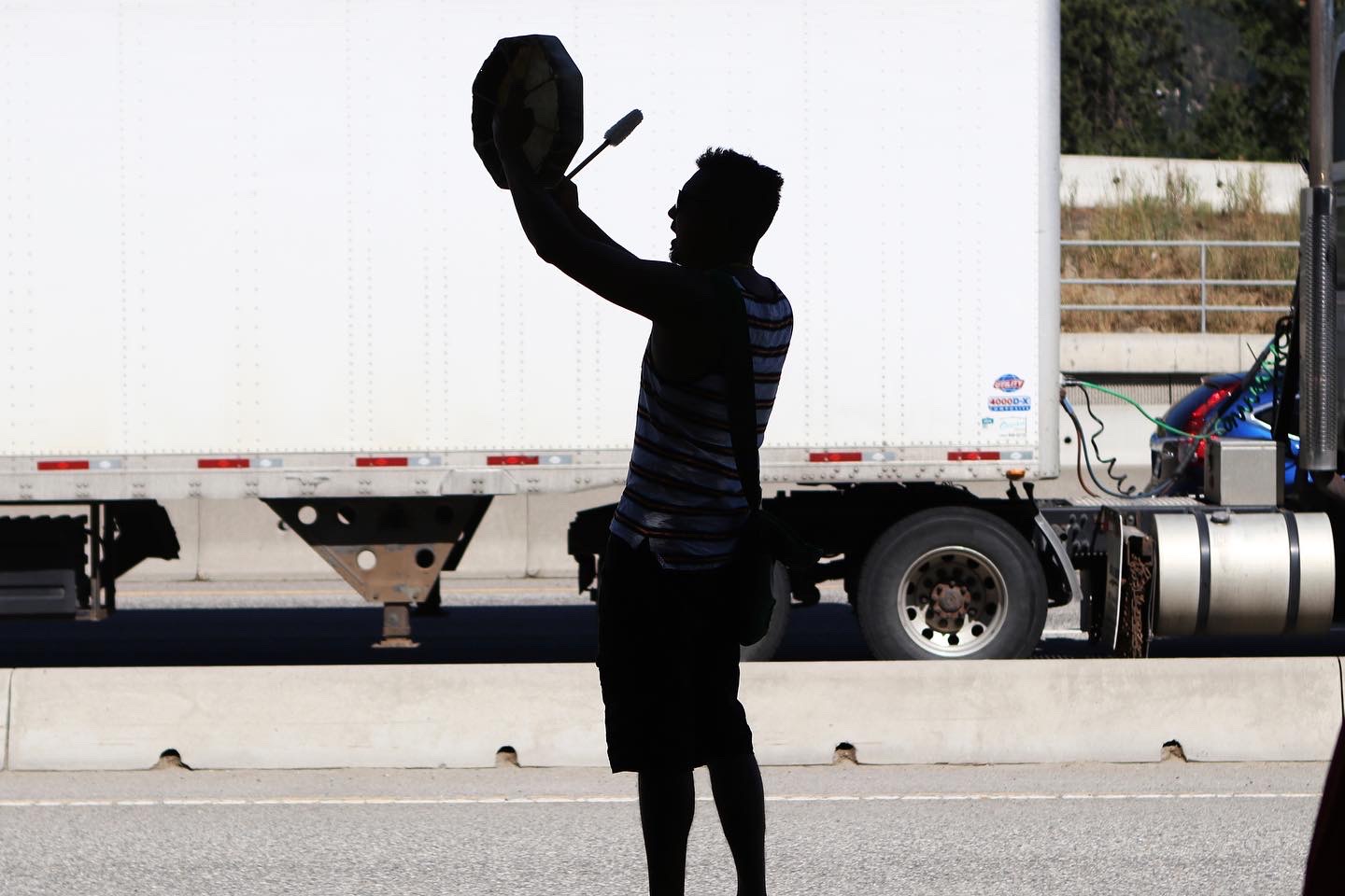 Westbank First Nation (WFN) councillor Jordan Coble plays a drum song outside of the WFN office near Highway 97 in Kelowna. The office served as one of five caravan start points for the Caravan in Unity event on June 26, 2021, which saw a convoy make its way to the site of the former Kamloops Residential School later that day.