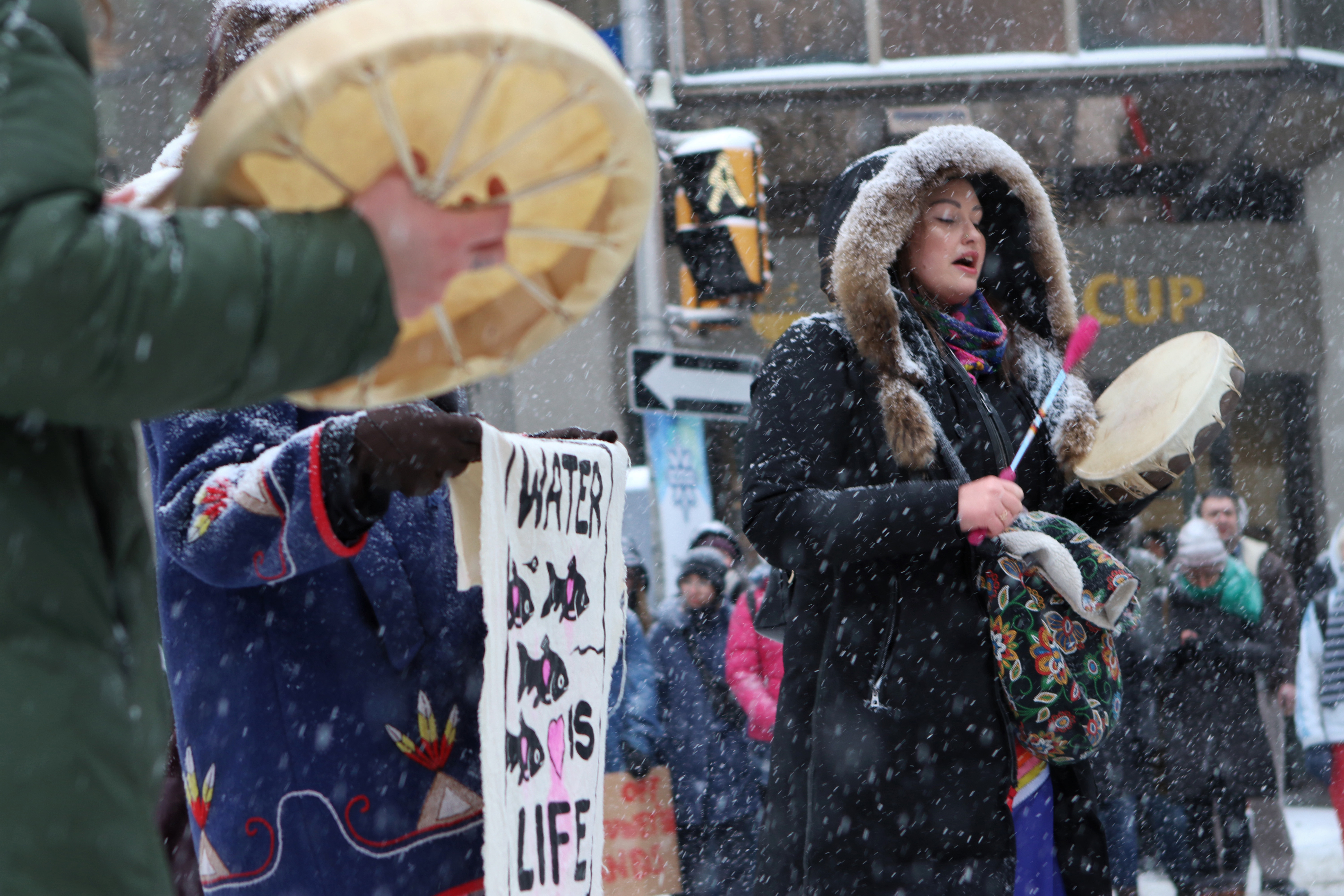 Demonstators formed a circle around drum song performers at the intersection of Slater Street and Metcalfe Street in Ottawa on Feb. 7, 2020, during a solidarity rally and march for members of the Wet’suwet’en First Nation who were arressted earlier in the week for protesting the construction of a pipeline on their ancestral lands in B.C.