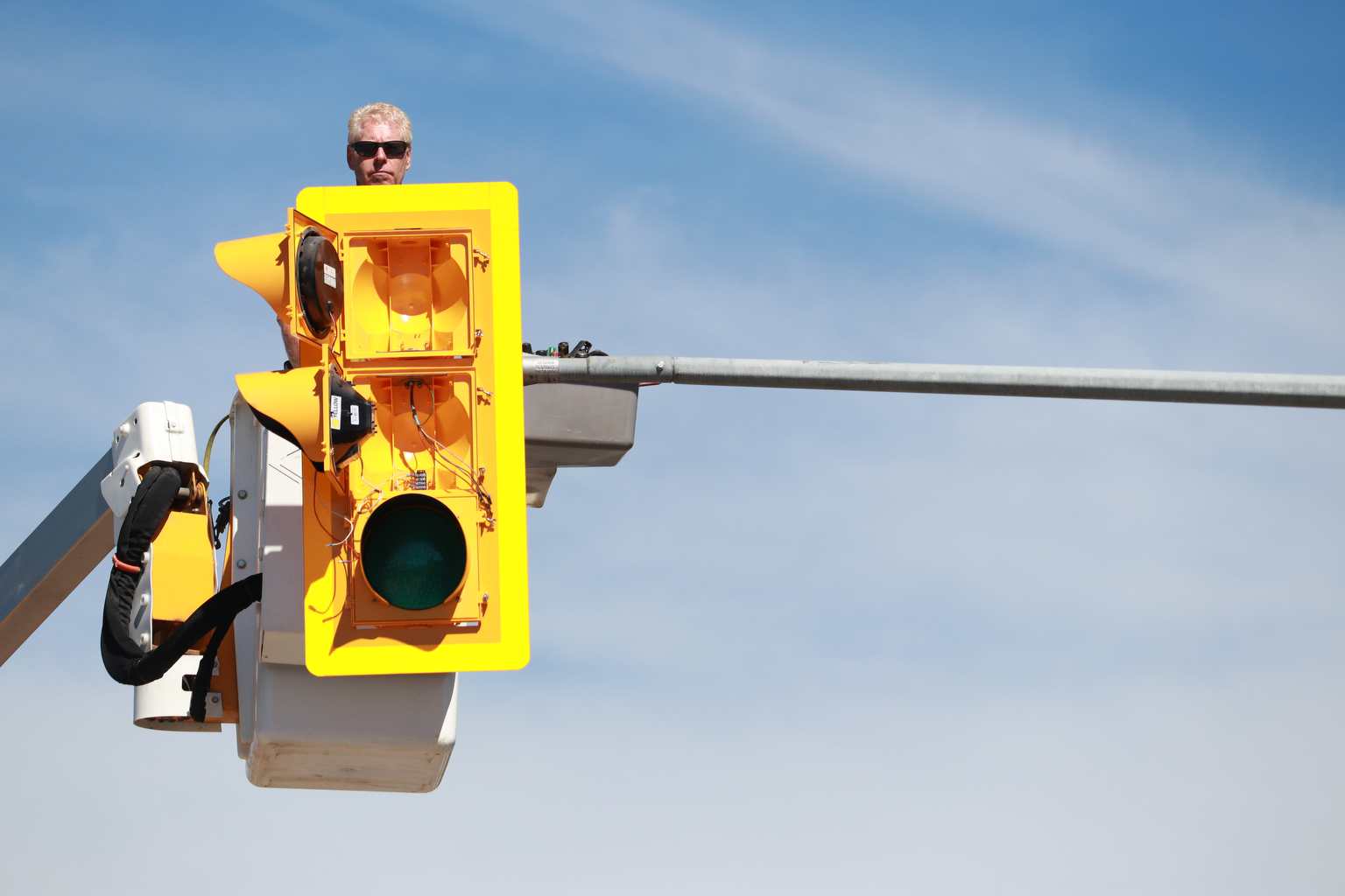 Previous Image Next Image A Westcana Electric employee installs a new yellow traffic light box in Creston, B.C. on Sept. 4, 2020.