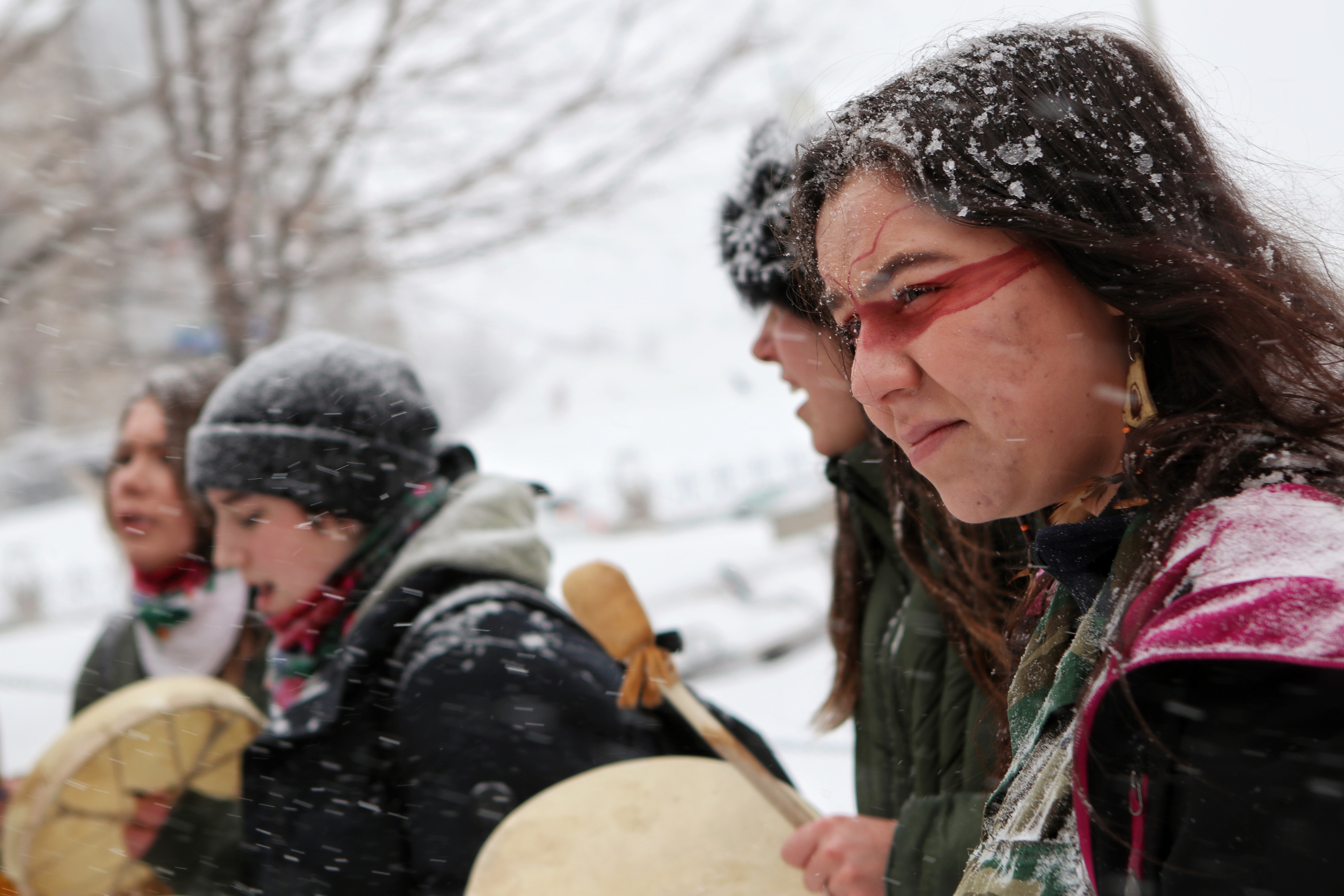 Sophia Sidarous, a Mi’kmaq from the Metepenagiag First Nation, performs a drum song near the National War Memorial in Ottawa with other Indigenous youth during a solidarity march and rally for members of the Wet’suwet’en First Nation on Feb. 7, 2020.