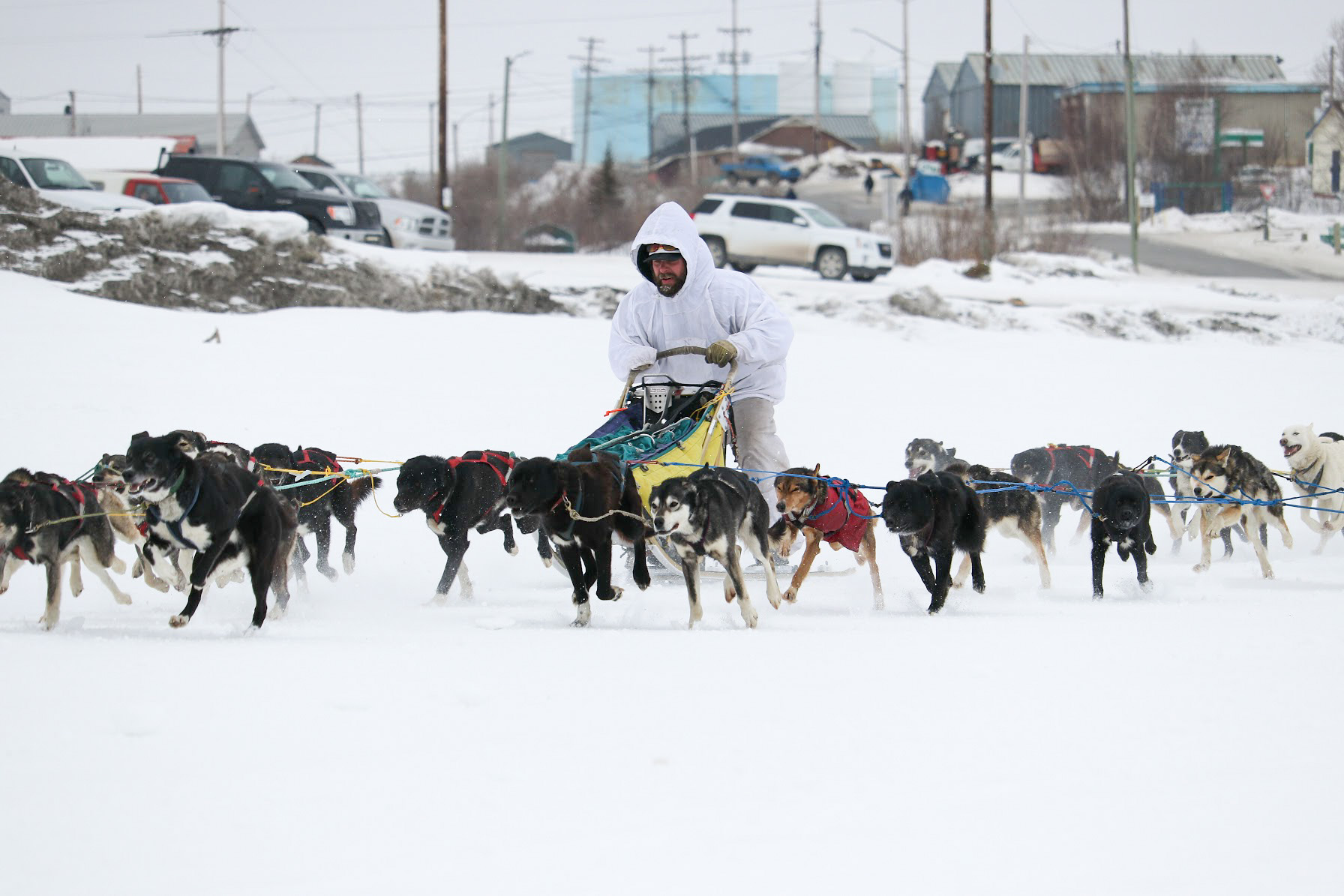 A dog sled race, also known as mushing, commences down by the frozen Mackenzie River during Inuvik’s 62nd annual Muskrat Jamboree festival in April 2019.