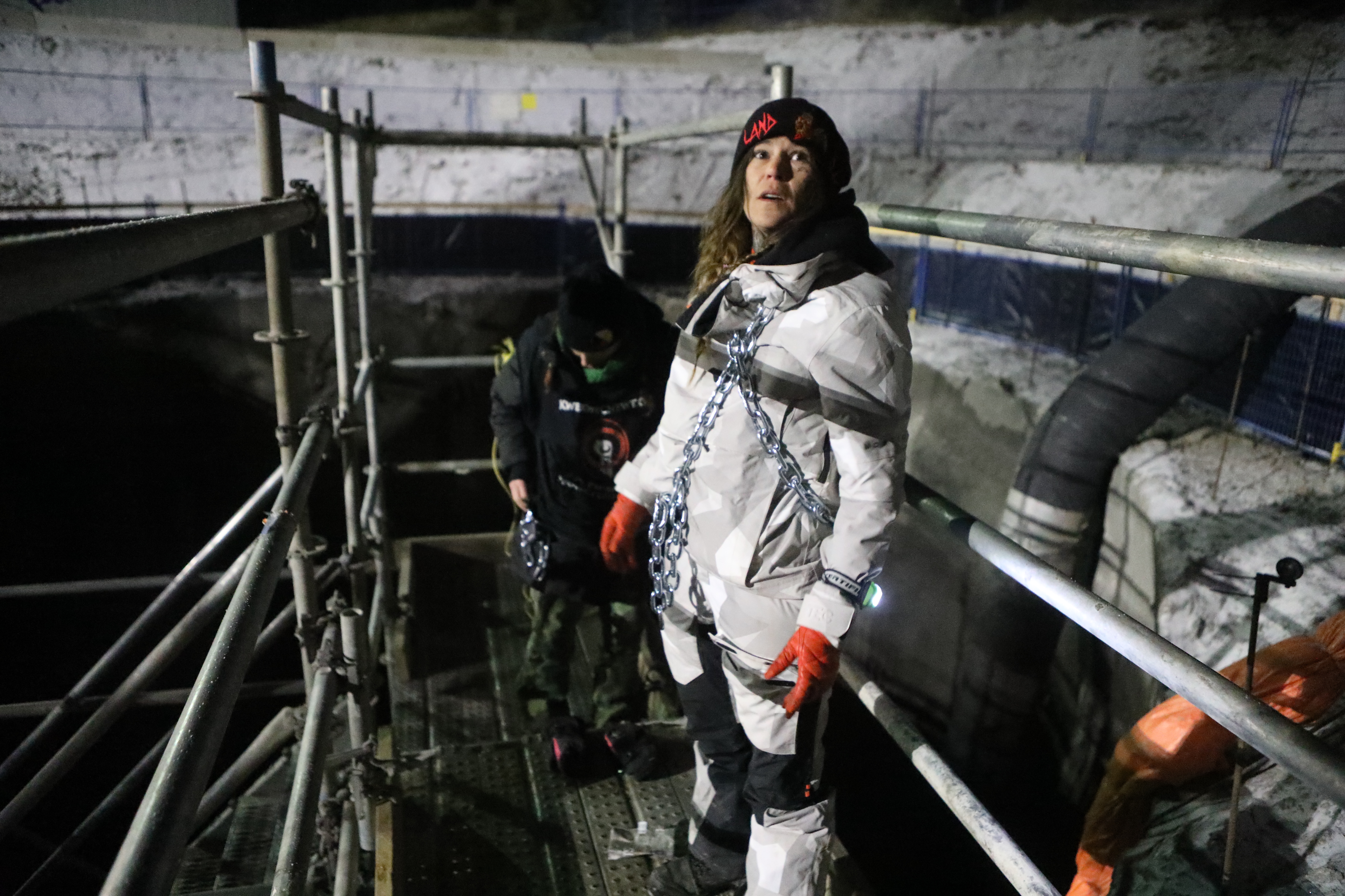Land defenders Cassie Fox and Khursten Bullock chain themselves to scaffolding at the site of the Trans Mountain Pipeline Expansion (TMX) projectÕs development at Pipsell in SecwepemclÕecw, on Dec. 10, 2023. Photo by Aaron Hemens for IndigiNews
