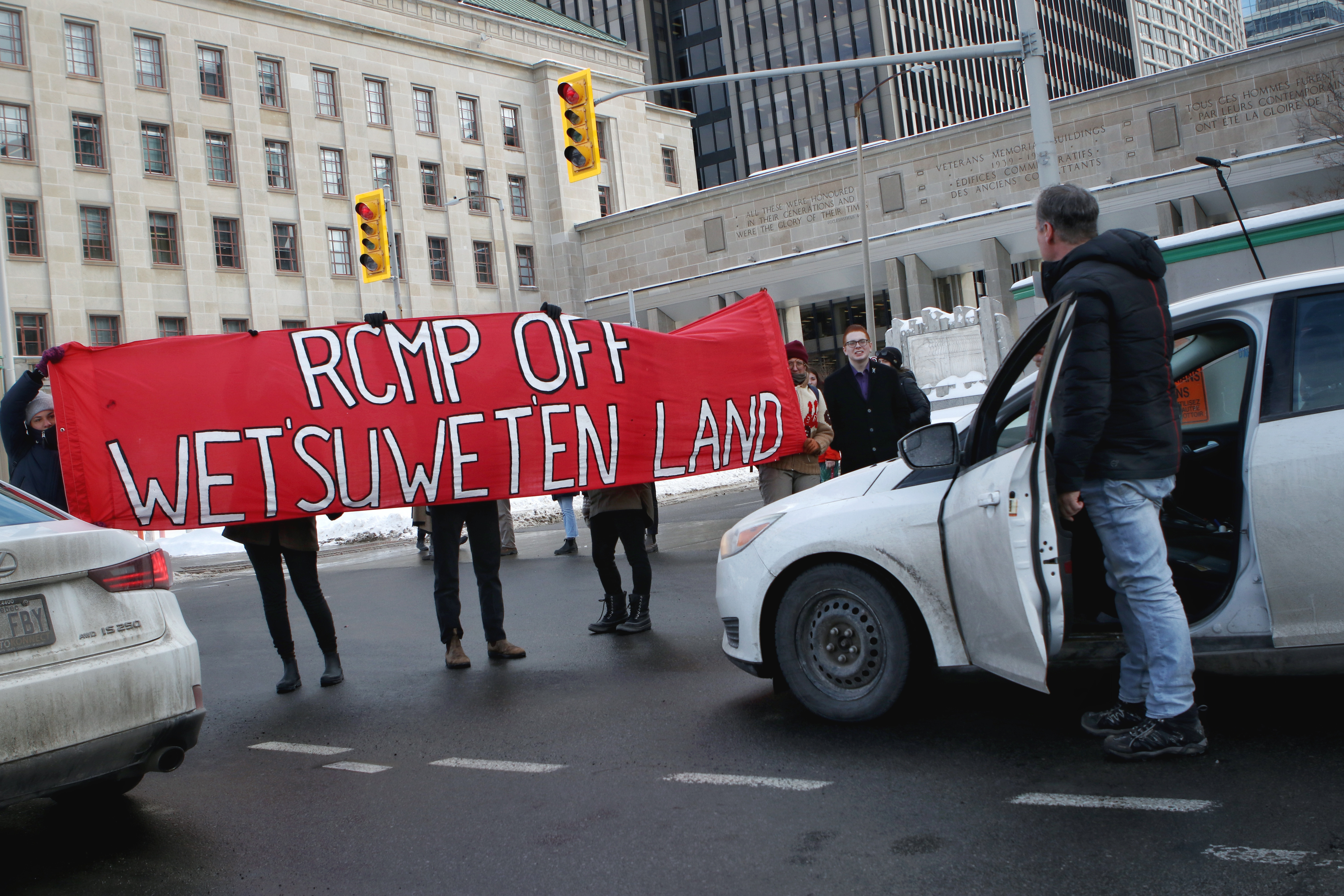 A man gets out of his car and confronts Wet’suwet’en supporters in Ottawa who halted traffic outside of the Justice Building on Feb.12, 2020.
