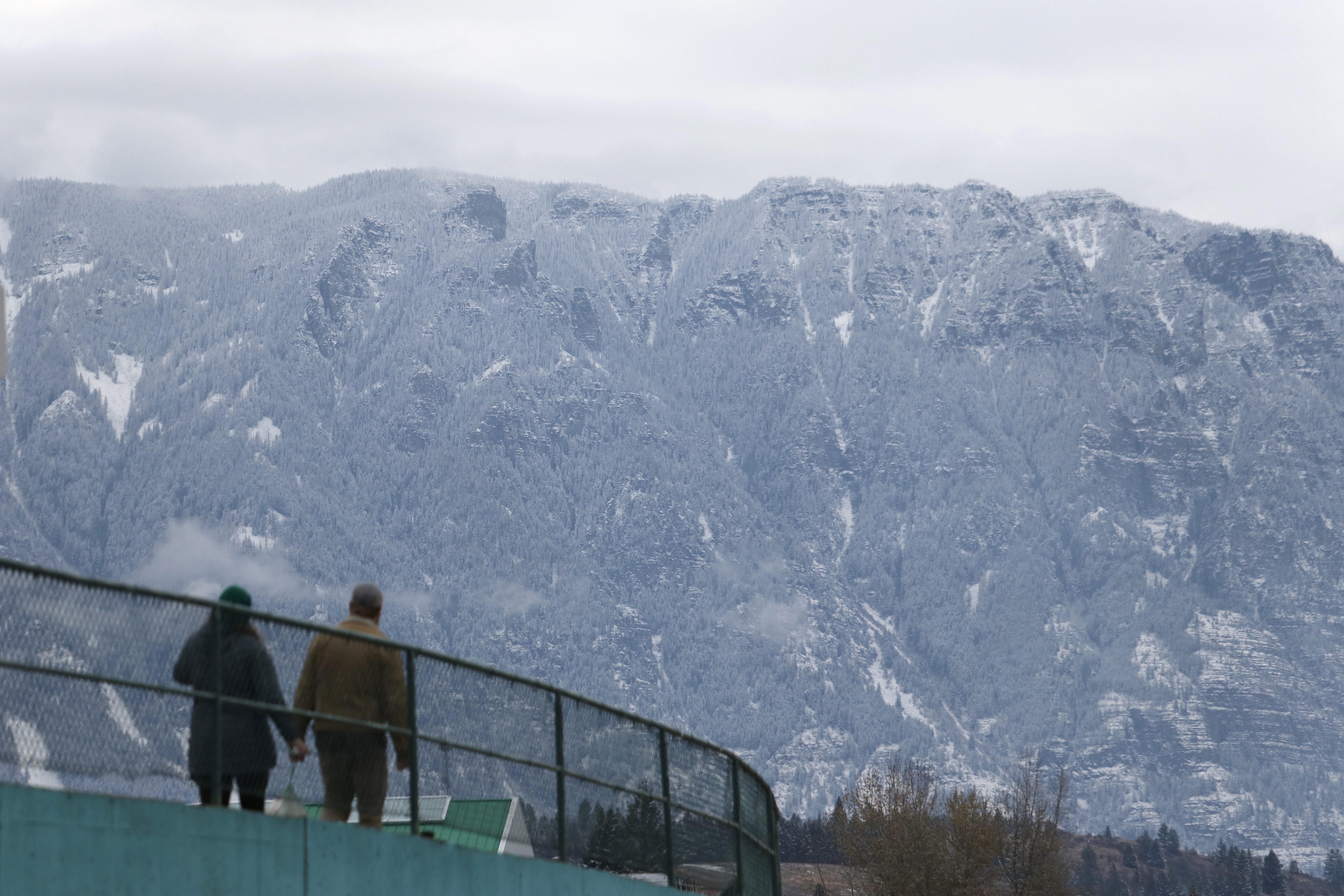 The Skimmerhorn Mountains tower over a couple as they go for a midday walk. November 2020. Shot for the Creston Valley Advance