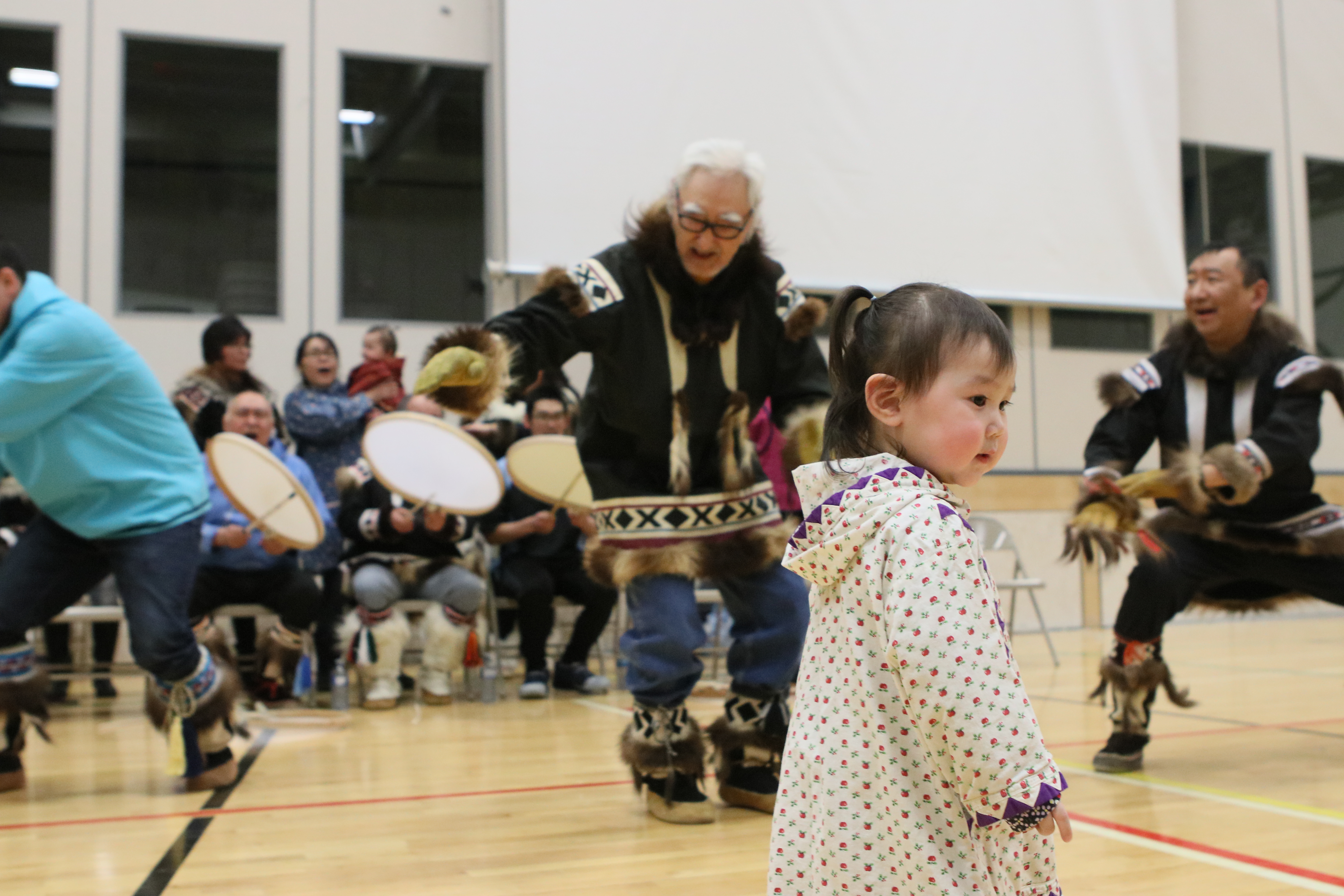 Drum dance during the opening ceremonies for the 2019 Northern and Dene Games Summit in Inuvik in March. Photobombed by Payton Inglangasuk.