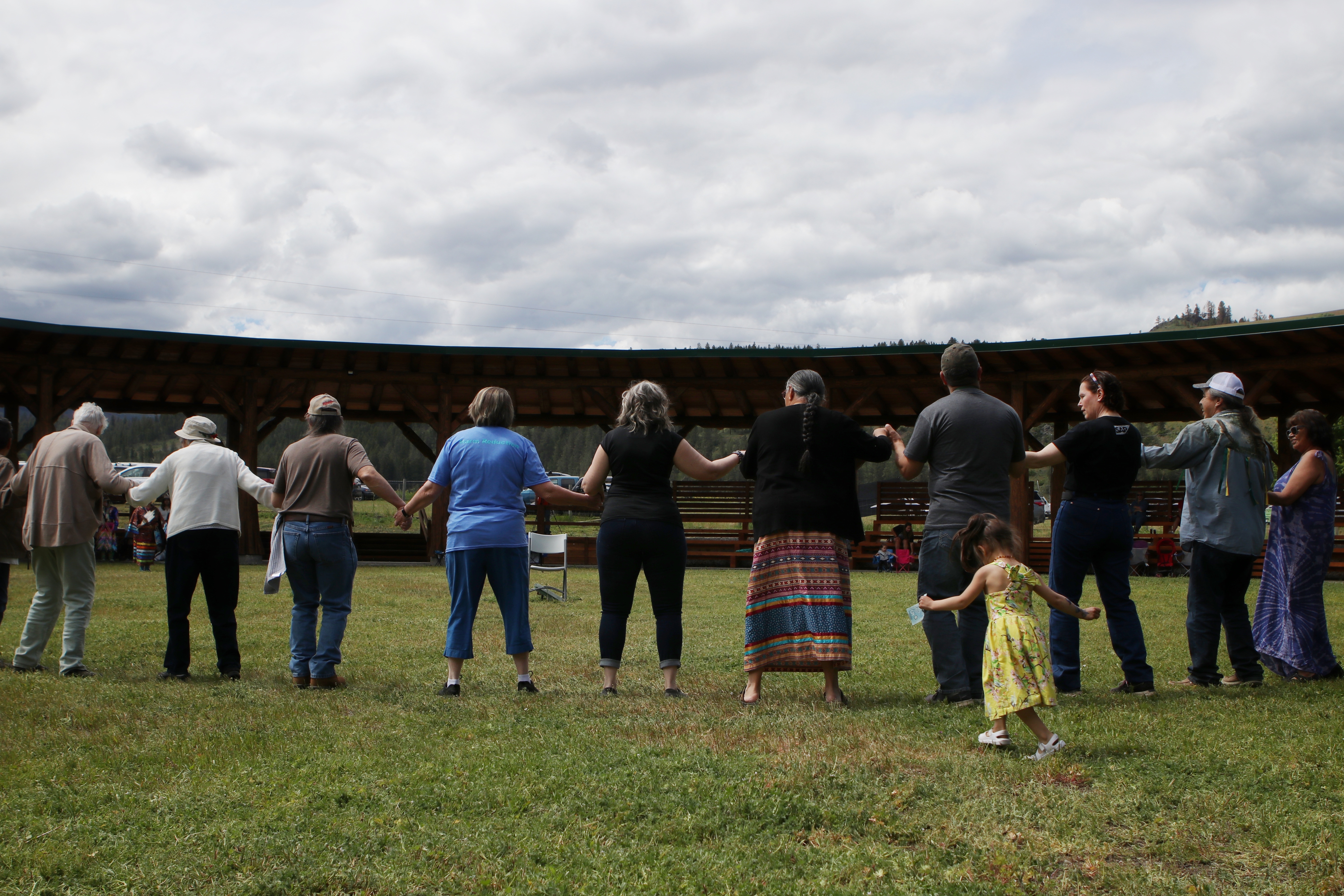 Elders participate in a Round Dance during the Okanagan Indian Band’s grand reopening of its Cultural Arbor on May 28, 2022.
