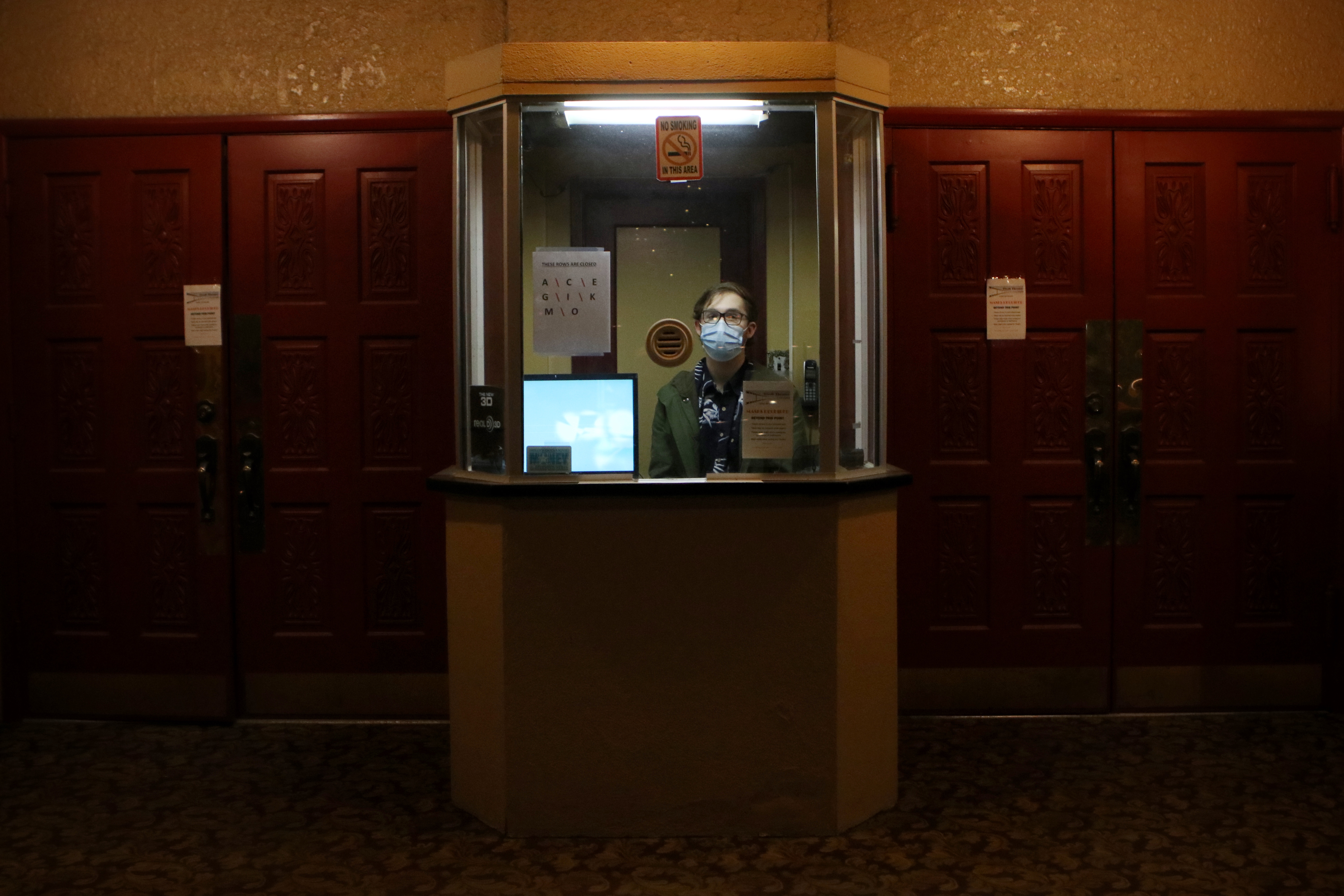 Tivoli Theatre employee Noah Doyle stands inside of the ticket booth during the theatre’s soft re-opening night in Creston, B.C., on Oct. 26, 2020. The theatre had been closed since March due to the COVID-19 pandemic.